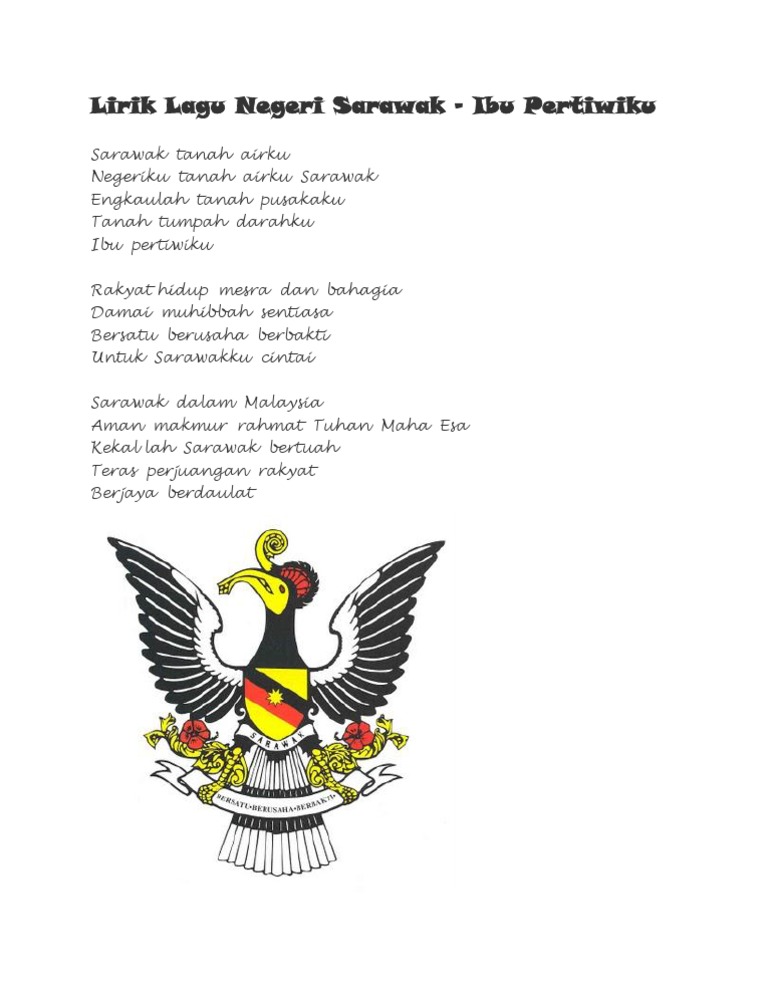 Sarawak tanah airku negeriku tanah airku Sarawak engkaulah tanah pusakaku tanah tumpah darahku Ibu Pertiwiku. Lirik Lagu Negeri Sarawak Lagu Negeri. Lagu ini diperkenalkan serentak dengan pengenalan bendera rasmi negeri.