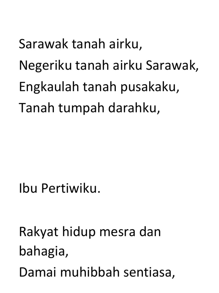 Sarawak Tanah Airku Negeriku Tanah Airku Sarawak Engkaulah tanah pusakaku Tanah tumpah darahku Ibu pertiwiku Rakyat hidup mesra dan bahagia Damai muhibah sentiasa Bersatu. Bersatuberusahaberbakti untuk Sarawakku cintai. Lirik Lagu Negeri Sarawak Ibu Pertiwiku Pdf Selangor 1 P095 Tanjong Karang Noh Omar Wilayah Persekutuan Putrajaya 1 P125 Putrajaya Tengku Adnan Tengku Mansor.
